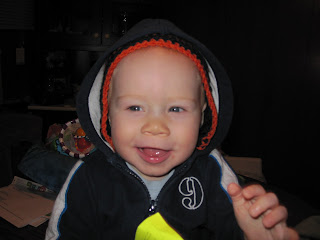 I was trying to get a picture of him as he made the motor boat sound (another new trick), but when the camera comes out, it's time to smile. (Look at his white gums... maybe a tooth will be coming soon?!)
